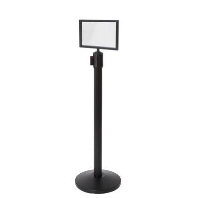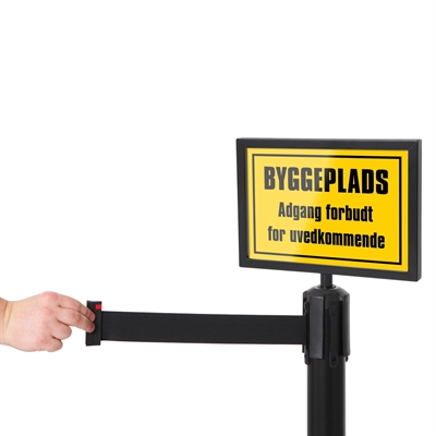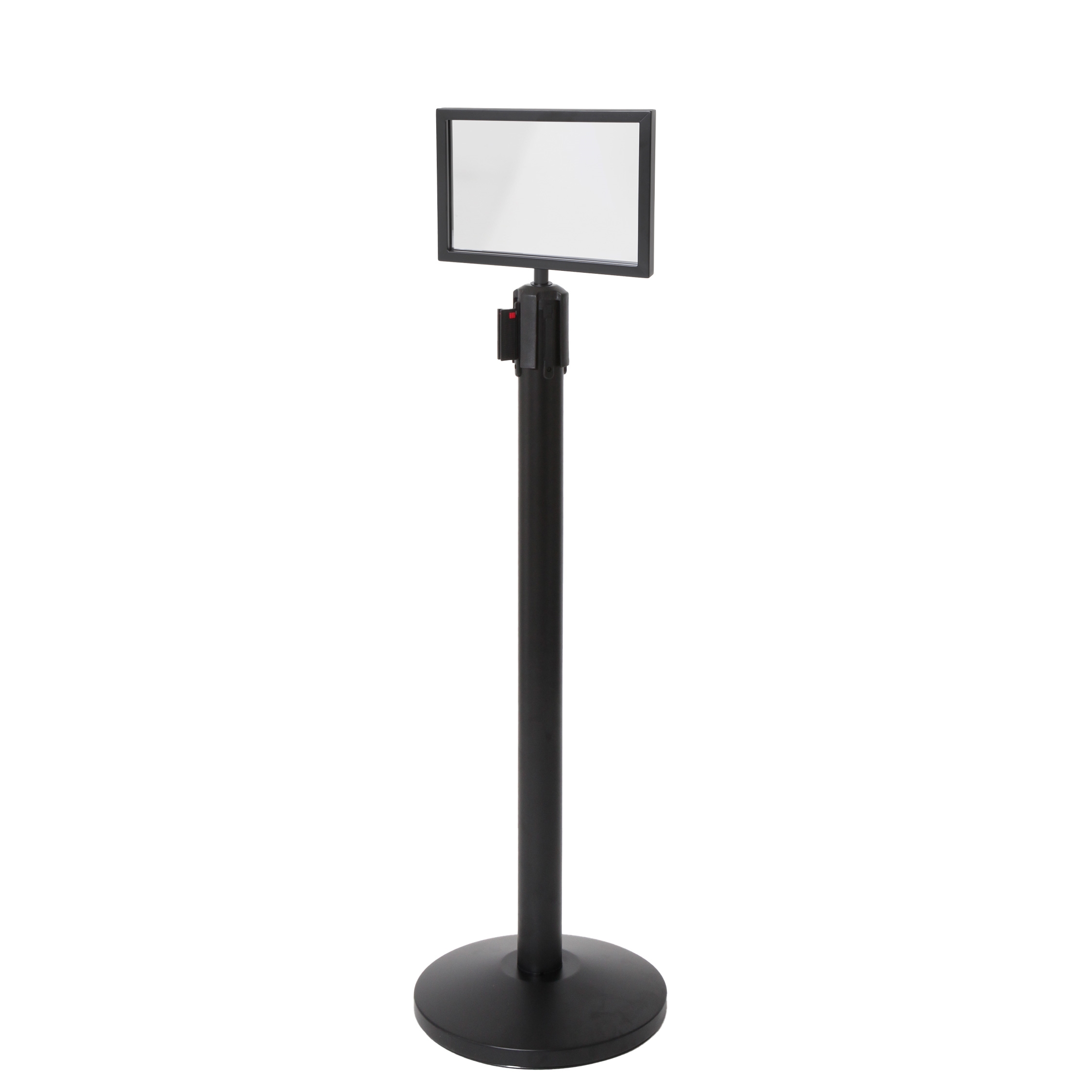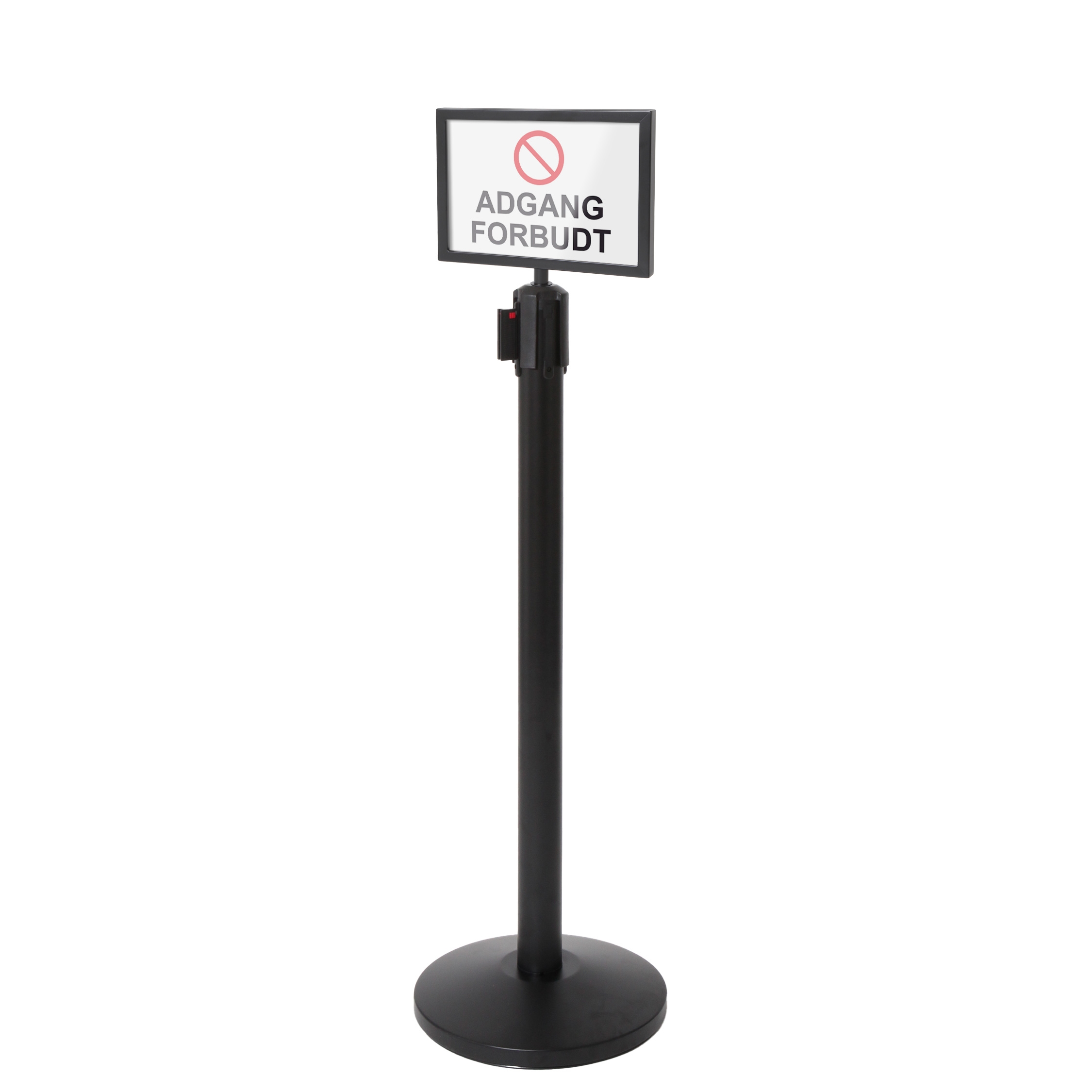Eleganter schwarzer A4-Plakatrahmen im Querformat, entwickelt zur Befestigung an Absperrpfosten mit Band. Ideal zur Anzeige von Hinweisen, Warnungen oder Wegbeschilderungen in abgesperrten Bereichen.