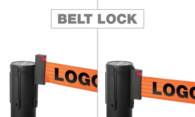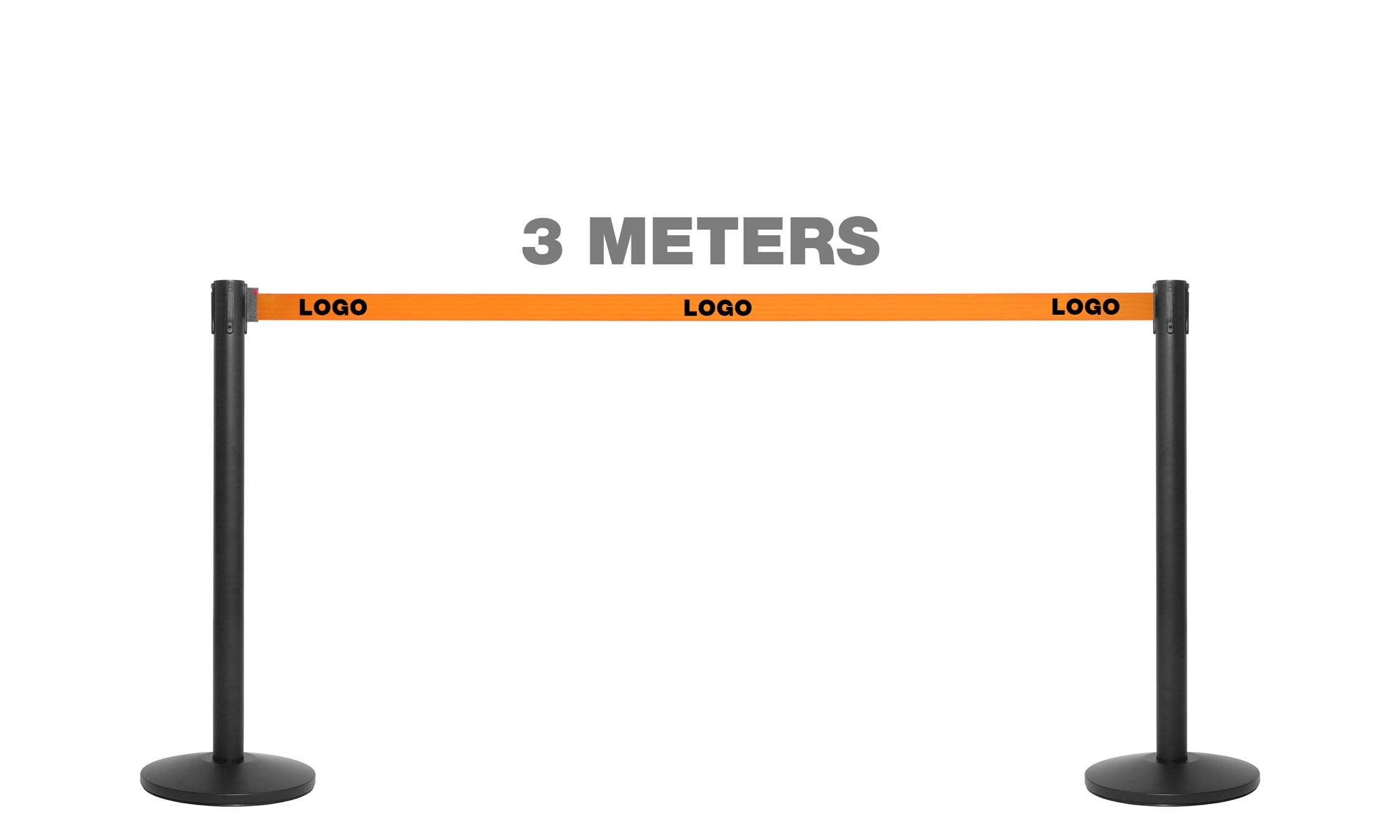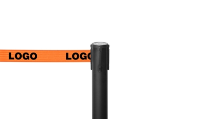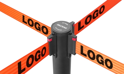Schwarzer Absperrständer inklusive angepasstem Druck auf beiden Seiten des Gurtes.