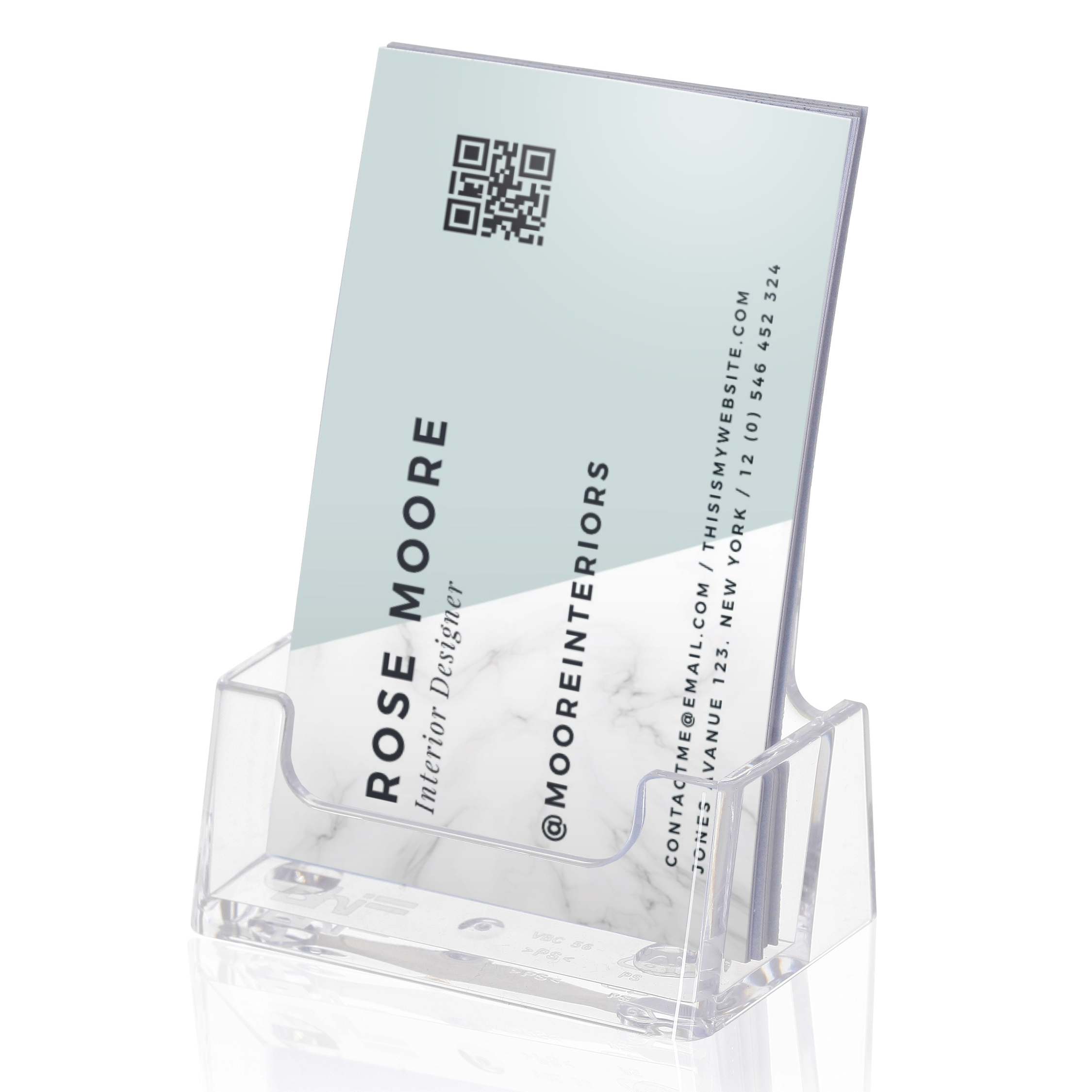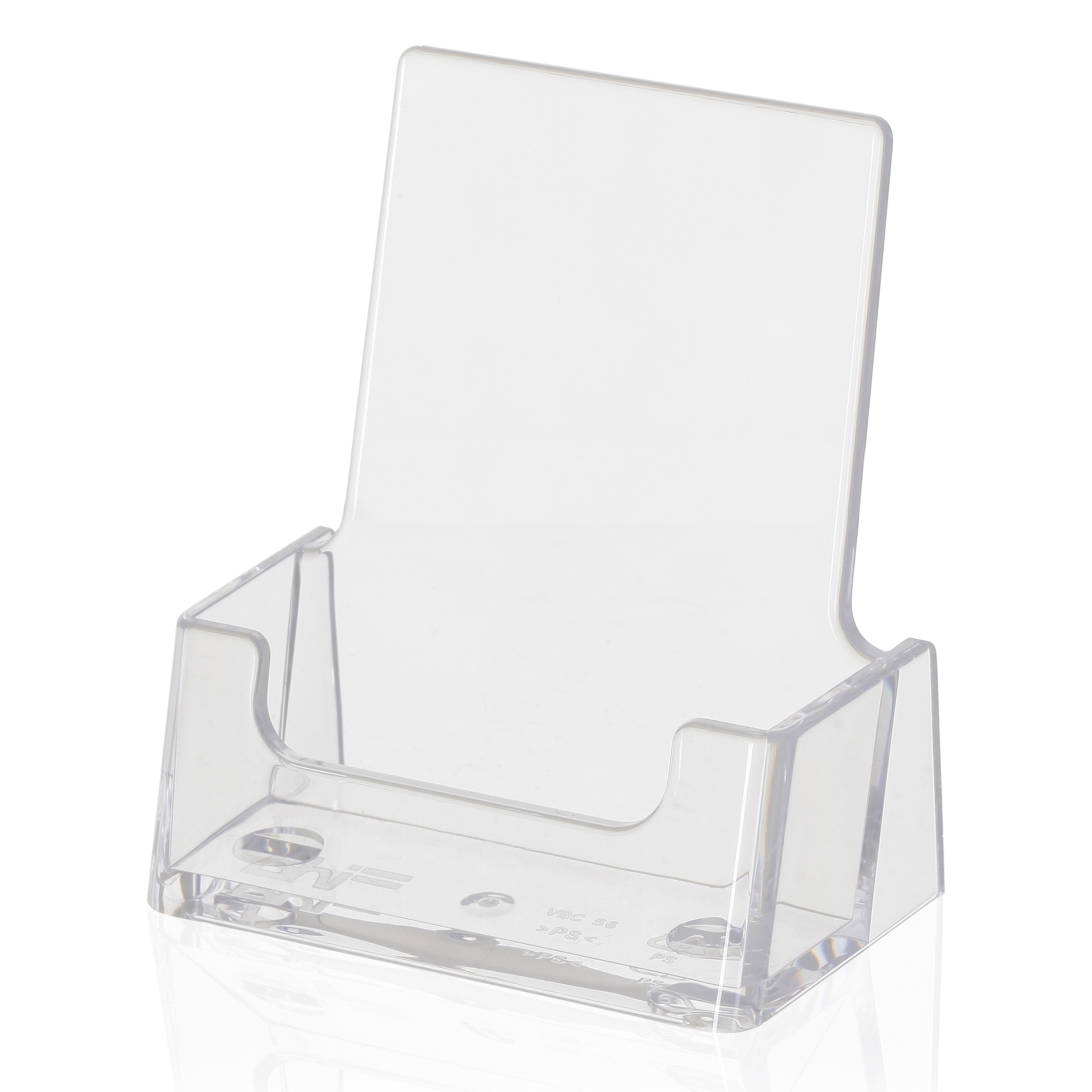 Dieser Visitenkartenhalter im Hochformat, der am Empfang oder einem Schreibtisch stehen kann, besteht aus hochwertigem glasklarem Acryl.