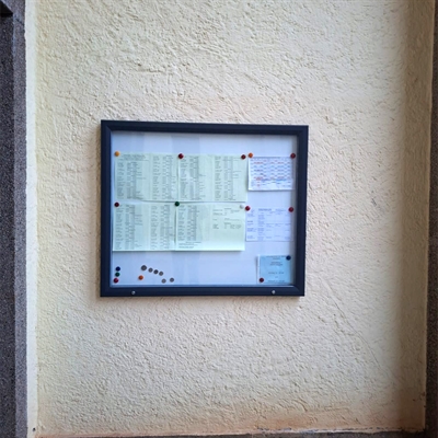 Das Scharnier besteht aus 4 mm dickem Sicherheitsglas und hat Gummileisten für optimalen Schutz vor Wind und Wetter. Die Rückwand ist magnetisch und kann mit Magneten oder als Whiteboard verwendet werden.