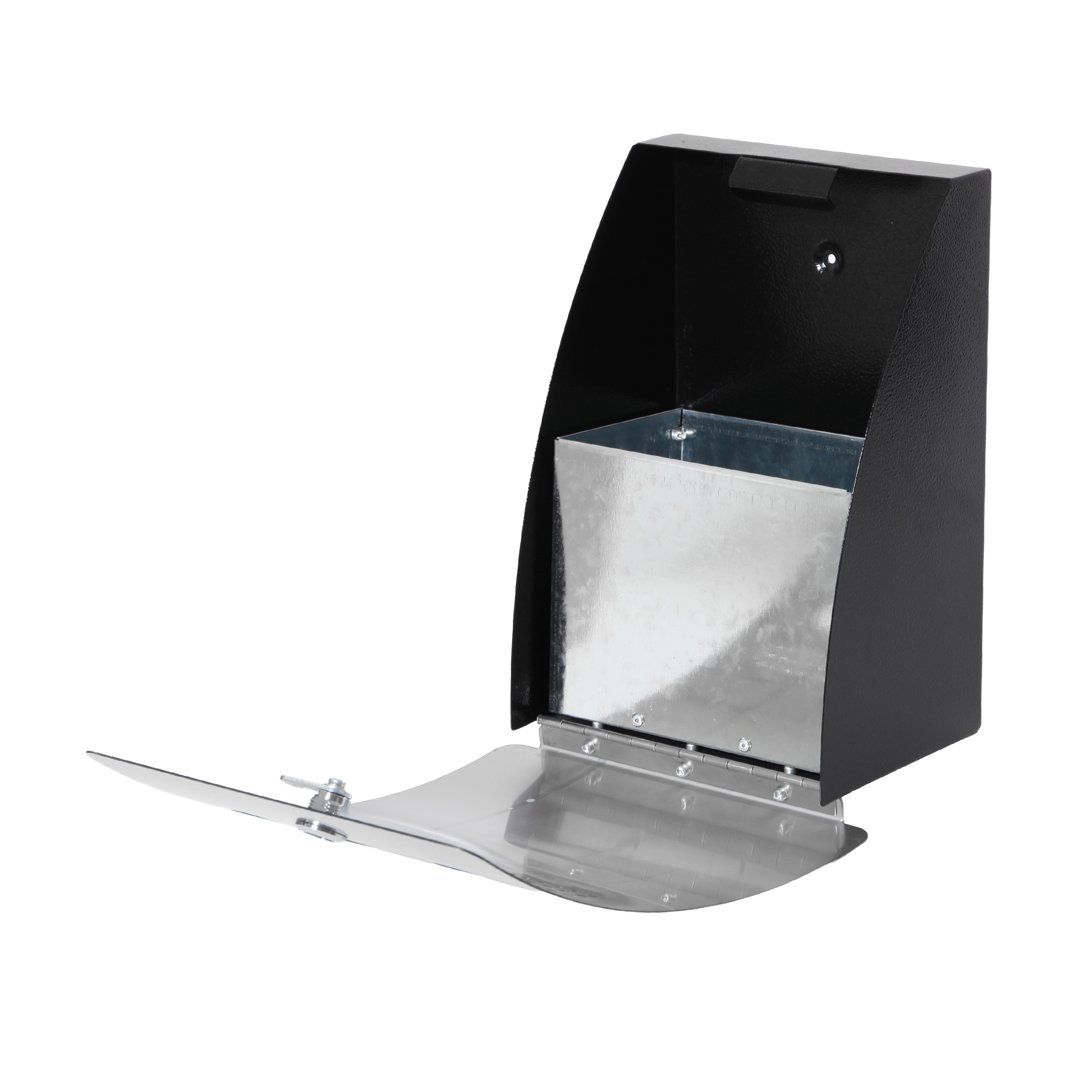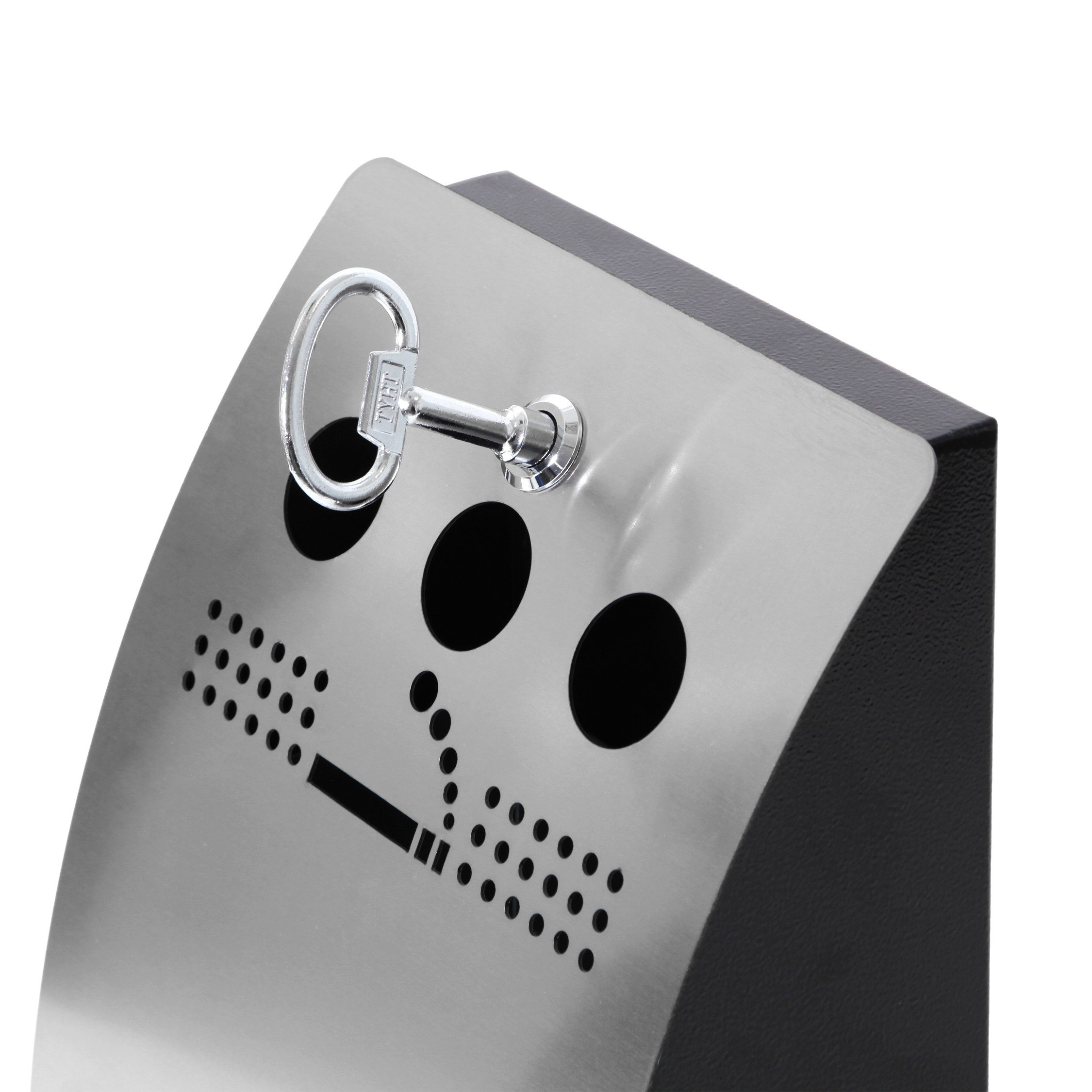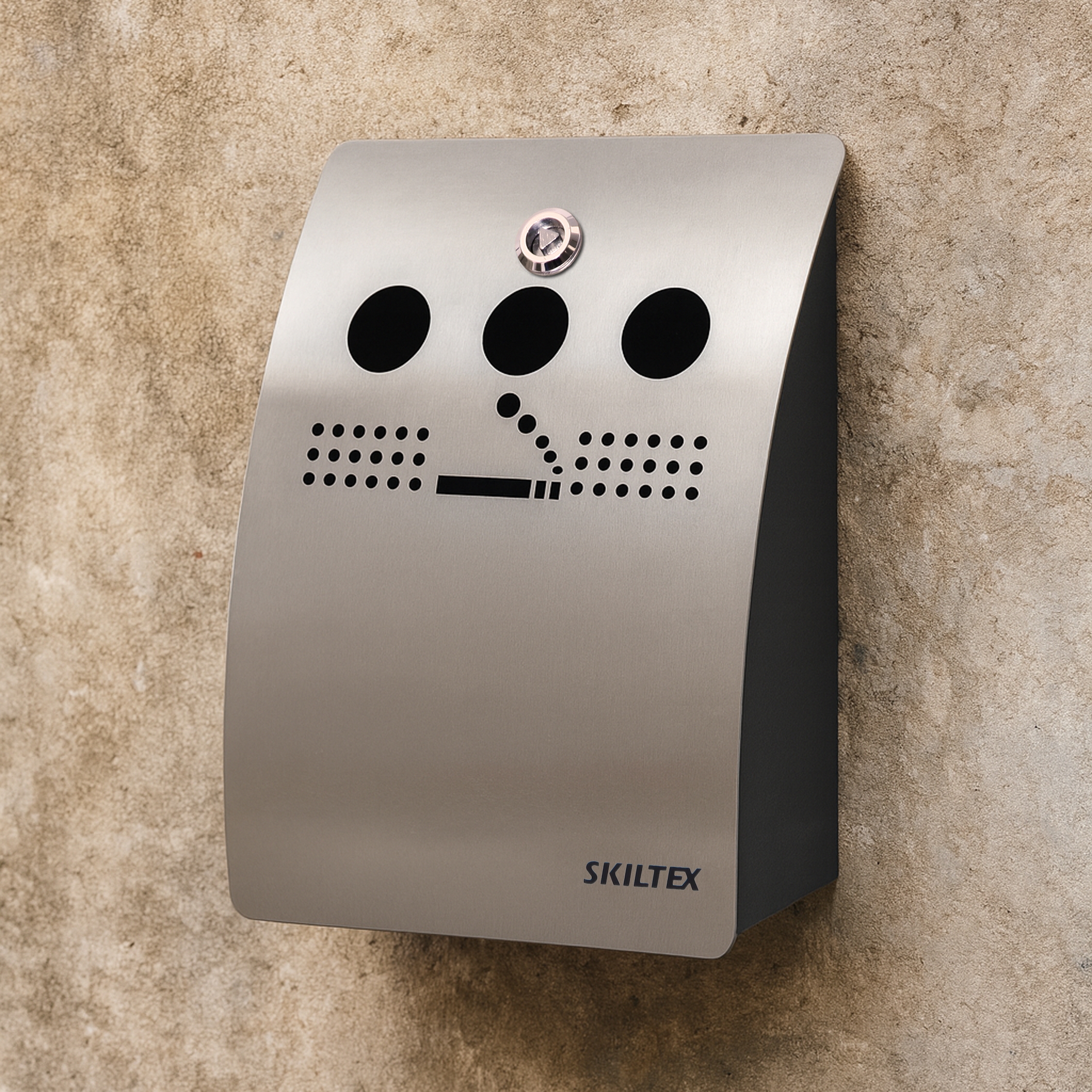 Ein robuster und stilvoller Außen Aschenbecher zur Wandmontage. Die gebogene schwarze Stahlkonstruktion in Kombination mit einer gebürsteten Edelstahlfront verleiht dem Aschenbecher ein hochwertiges Erscheinungsbild und eine besonders hohe Haltbarkeit. Die Front verfügt über drei Öffnungen mit Gitter, die eine einfache und sichere Entsorgung von Zigarettenresten ermöglichen. Der Aschenbecher ist mit einer abschließbaren Front und einem verzinkten Inneneinsatz ausgestattet, der eine hygienische und langlebige Nutzung gewährleistet.