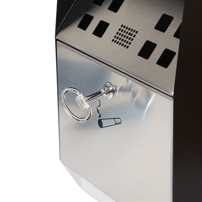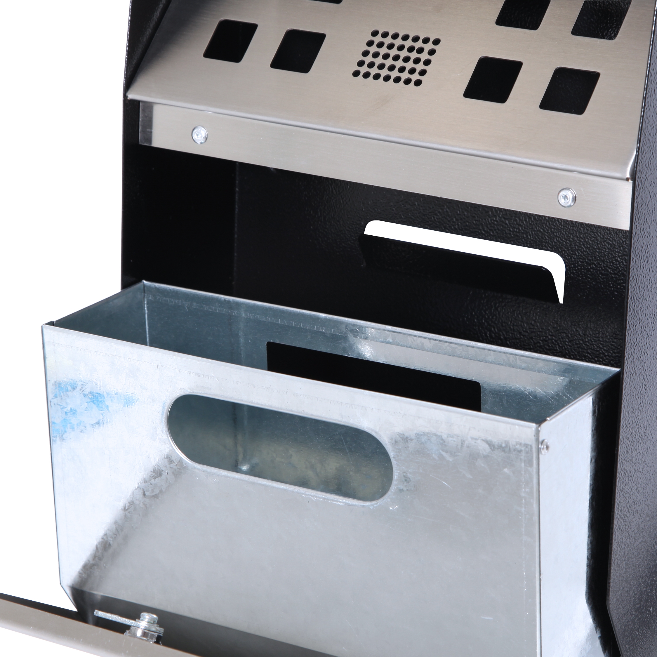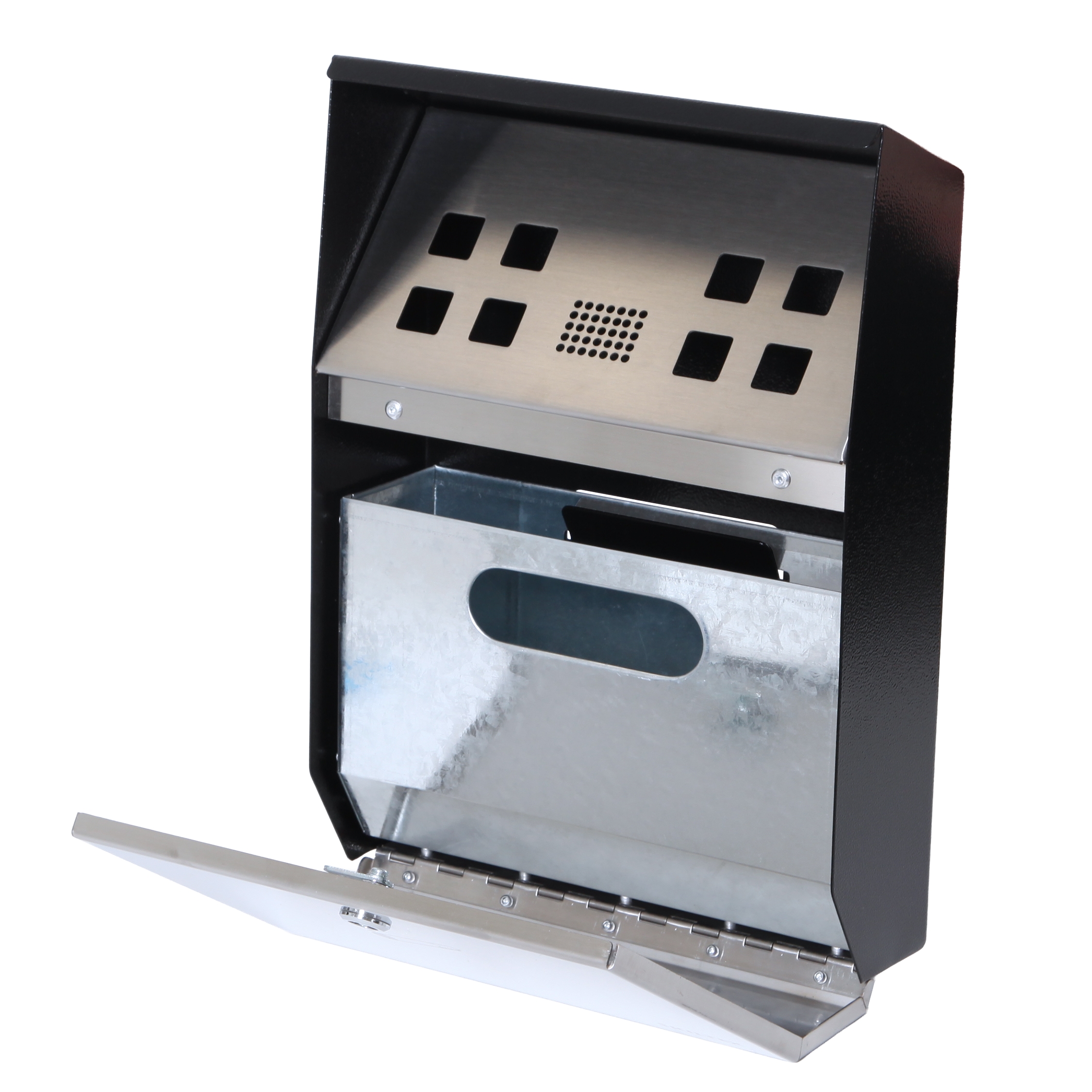 Ein hochwertiger und wetterfester Außen-Aschenbecher zur Wandmontage, hergestellt aus schwarz pulverbeschichtetem, verzinktem Stahl mit einer Front aus Edelstahl 316. Diese Materialkombination bietet eine sehr hohe Widerstandsfähigkeit gegen Rost und eignet sich für öffentliche Bereiche ebenso wie für küstennahe Standorte. Der Aschenbecher verfügt über mehrere Einwürfe mit Gitter sowie eine abschließbare Front, die eine einfache und sichere Entleerung ermöglicht.