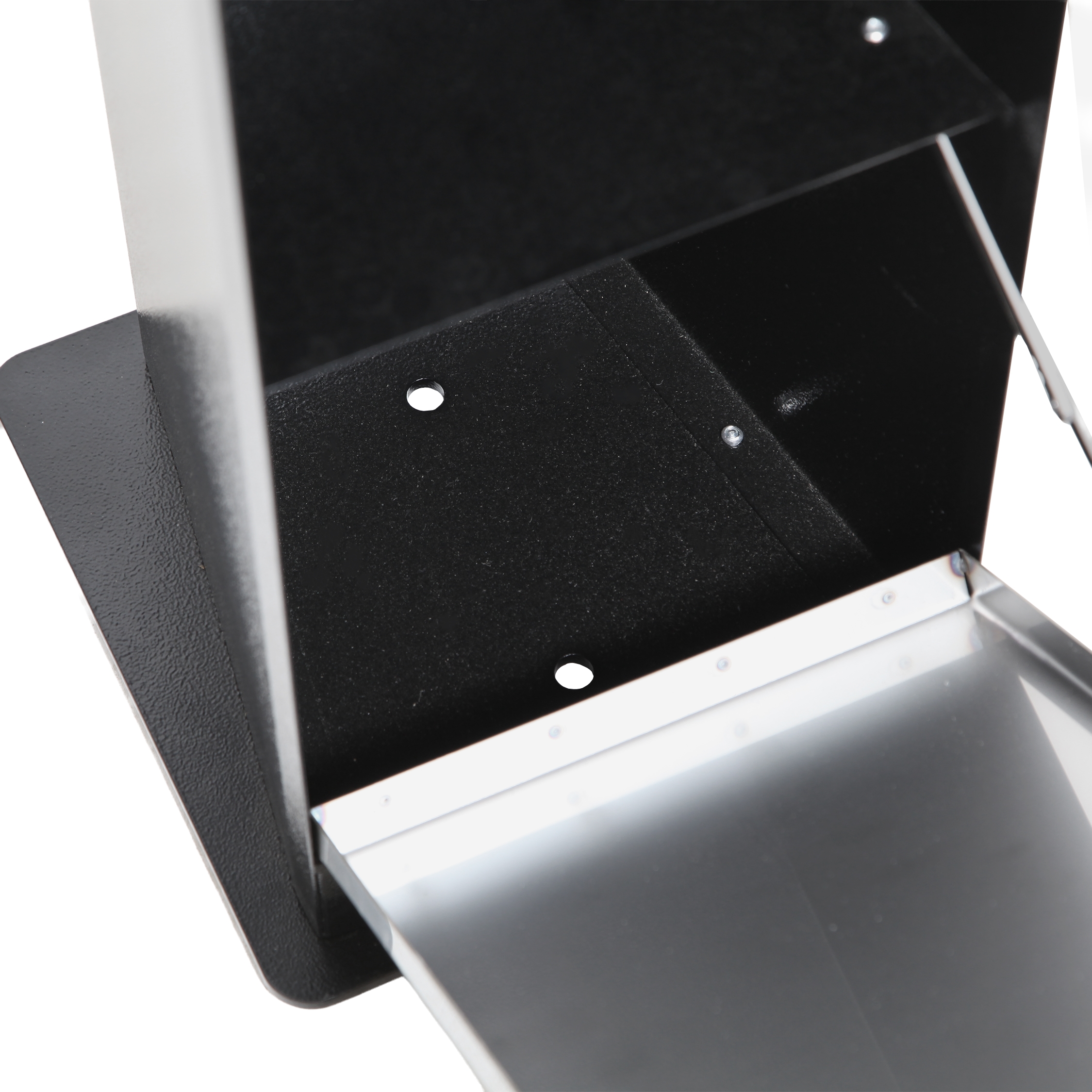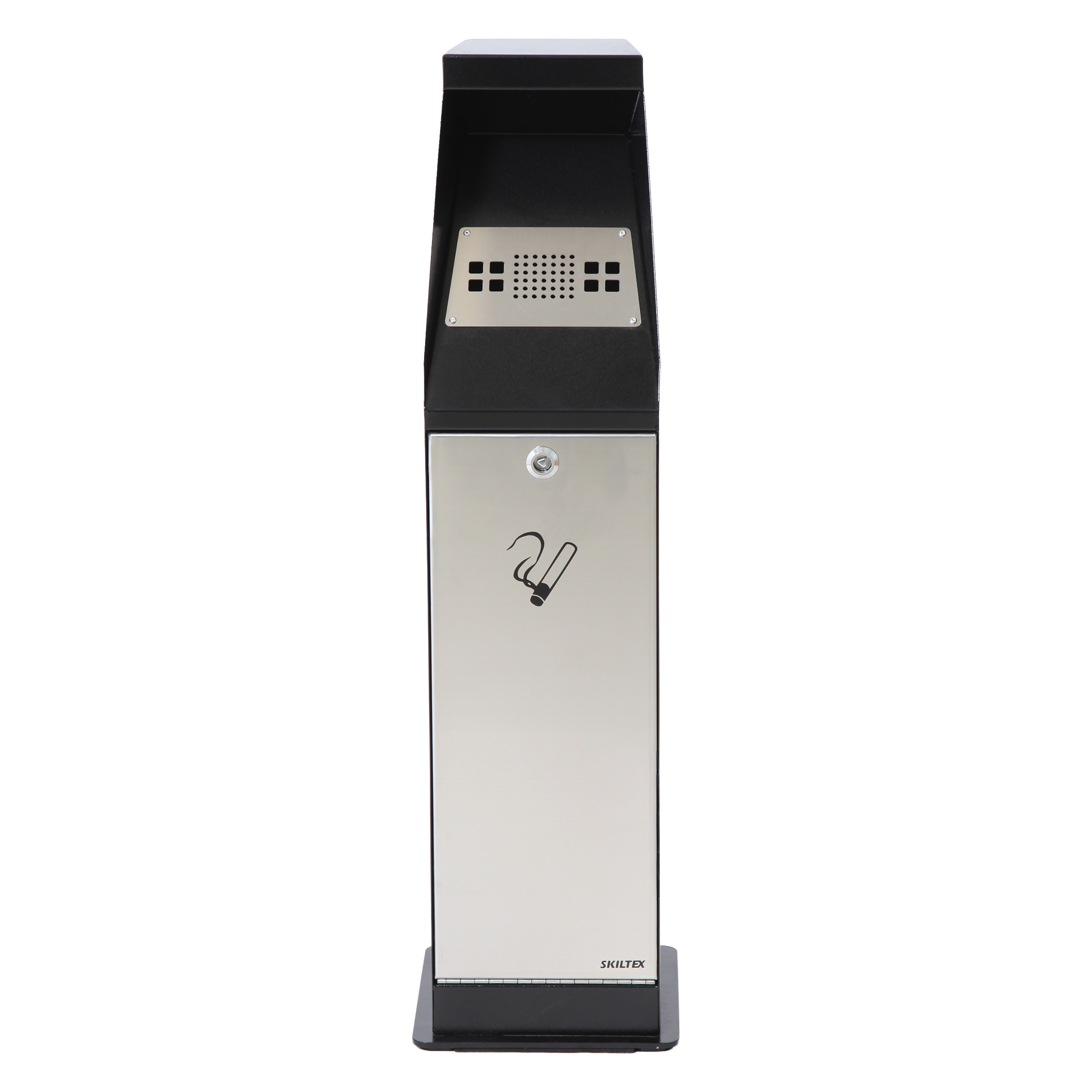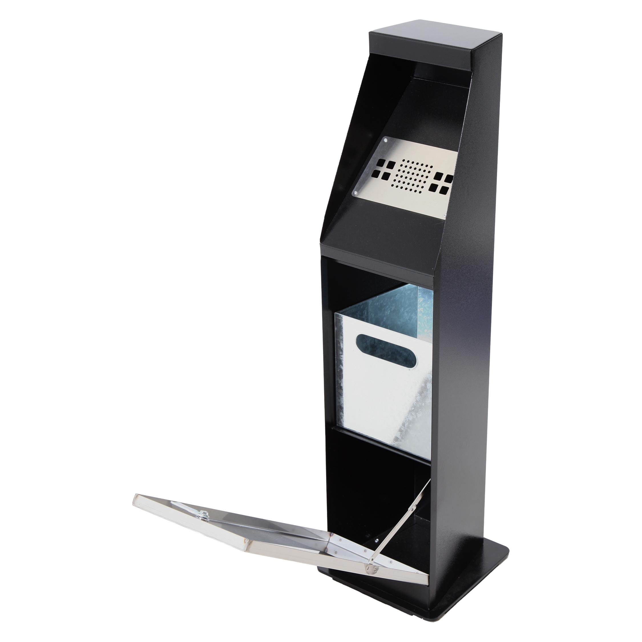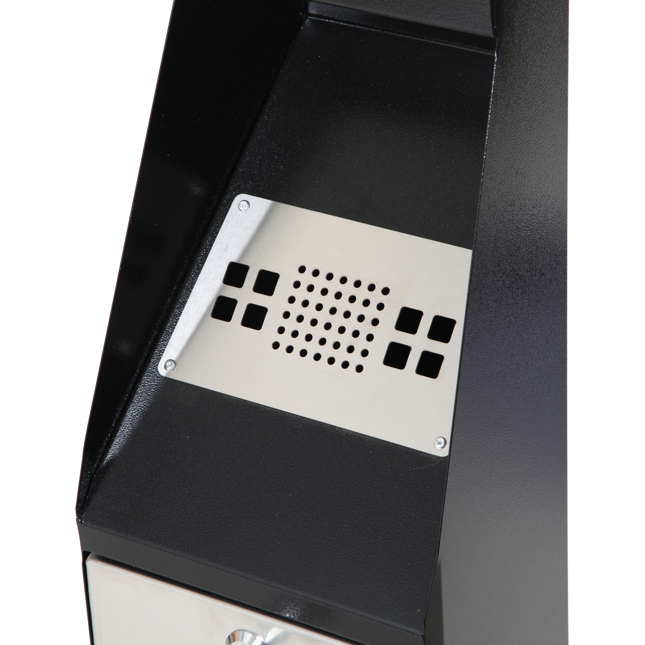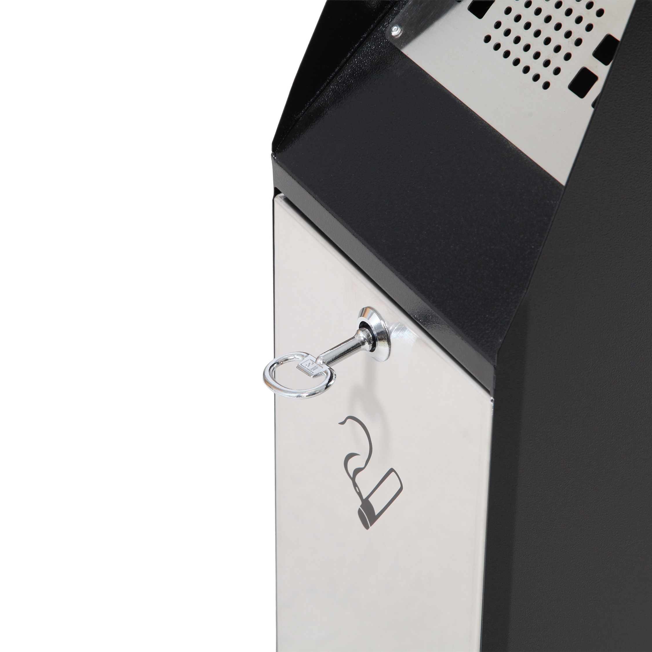 Ein hochwertiger und wetterfester freistehender Außen-Aschenbecher, gefertigt aus schwarz pulverbeschichtetem, verzinktem Stahl mit einer Front und einem Gitter aus Edelstahl 316. Die Kombination aus verzinktem Stahl und Edelstahl sorgt für eine sehr hohe Widerstandsfähigkeit bei Wind und Wetter und eignet sich ideal für öffentliche Bereiche sowie küstennahe Standorte, an denen normaler Stahl schneller korrodiert. Der Aschenbecher verfügt über mehrere Einwürfe mit Gitter, eine abschließbare Front und einen großzügigen verzinkten Inneneinsatz von 4,2 Litern für eine hygienische Entleerung. Befestigungsschrauben für dauerhafte Montage sind enthalten.