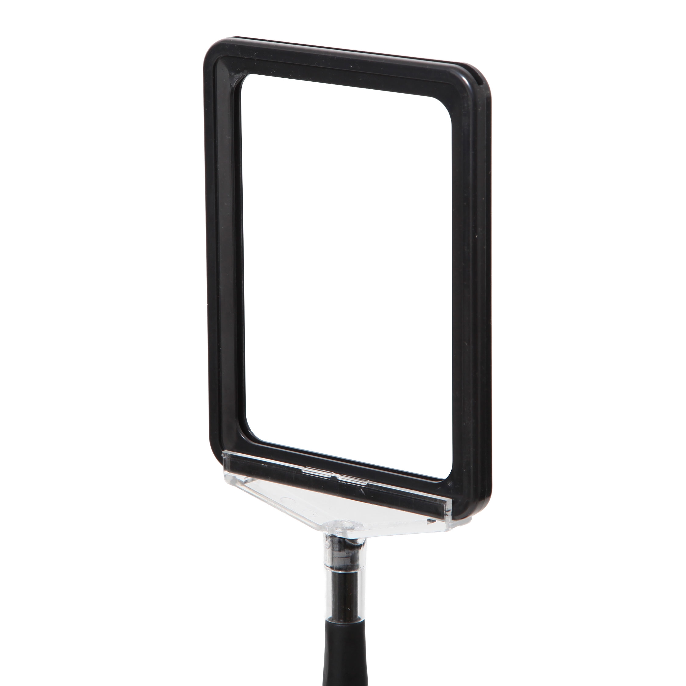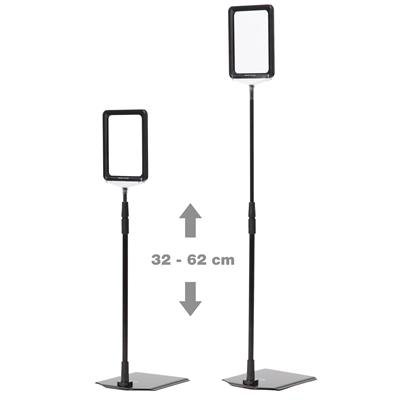 Der Schilderhalter ist mit einer schwarzen Teleskopstange von 32 bis 62 cm Höhe sowie einem Kunststoffrahmen mit oberer Öffnung (Hochformat) ausgestattet.