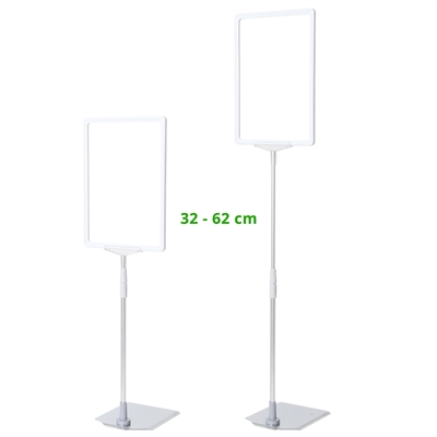 Hochqualitativer Schildhalter inklusive schwerem, stabilem Metallfuß mit chromefarbener Oberfläche, verstellbarer silbereloxierten Aluminium-Teleskopstange ( 32 - 62 cm ) und weißem ABS Kunststoffrahmen in A4