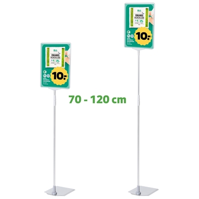 Schildhalter in Topqualität mit einem schönen, schweren und stabilen Metallfuß mit Chromoberfläche, verstellbarer silbereloxierter Aluminium-XL-Teleskopstange (70 bis 120 cm) und transparent A4-Rahmen aus ABS-Kunststoff.
