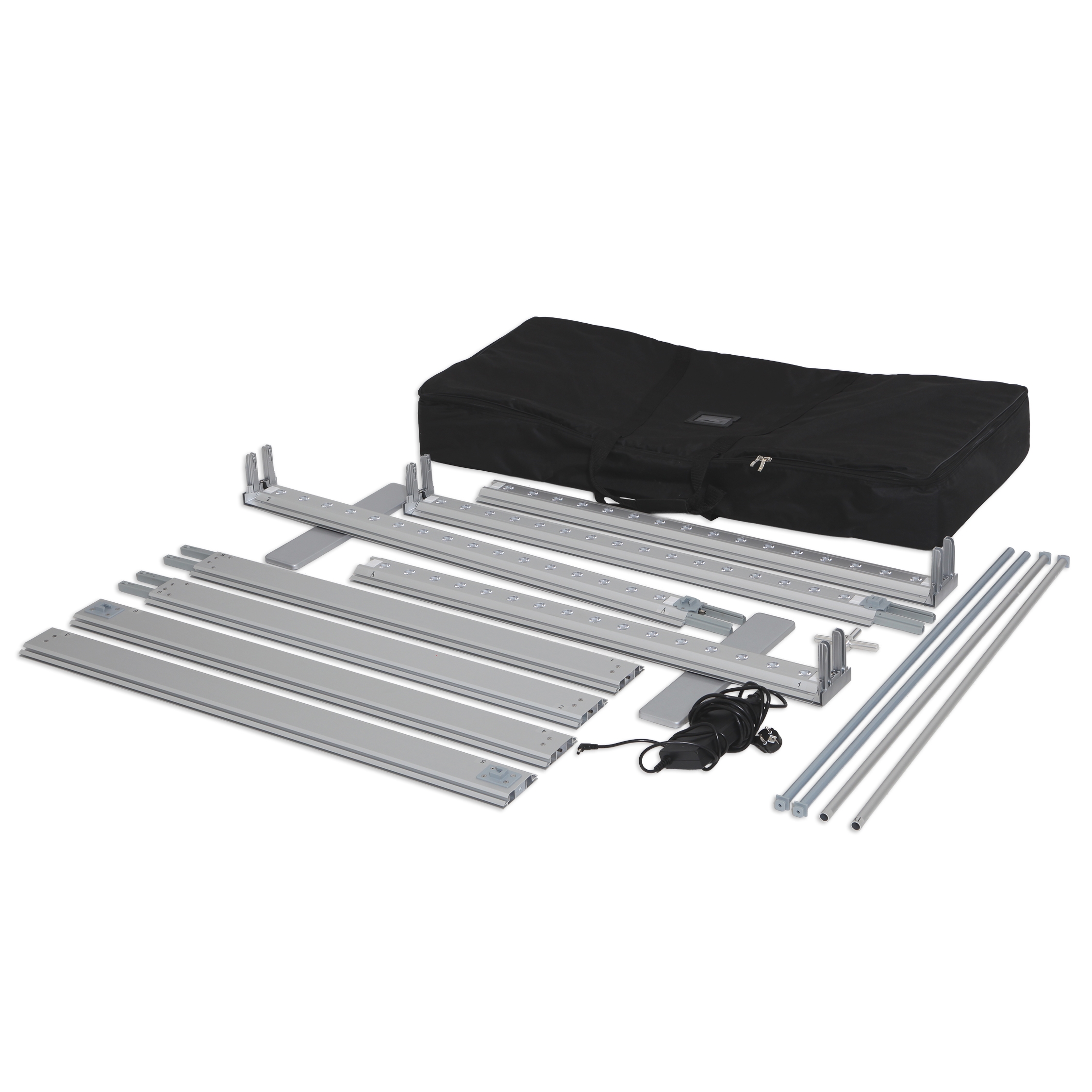Das gesamte System lässt sich in der mitgelieferten, gepolsterten, rollbaren Tasche verpacken, was es perfekt für den „on-the-go“- Einsatz auf Messen und Events macht.