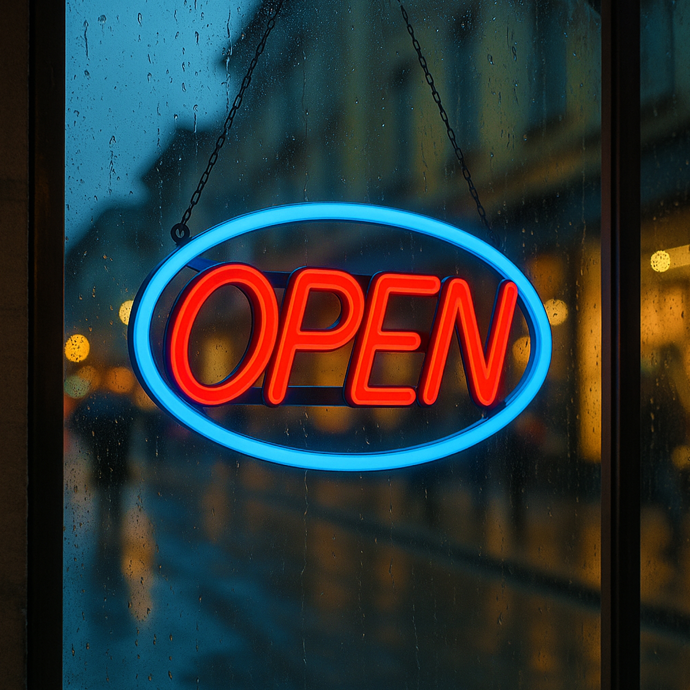 • Leuchtendes OPEN LED-Neonschild in Rot und Blau