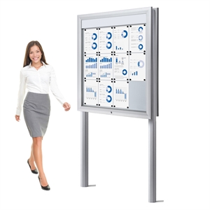 Gefertigt mit robuster silber eloxierter Rahmenkonstruktion und lackierter Stahlrückwand (Whiteboard). Der Schaukasten ist oben angeschlagen und mit Gasdruckfedern ausgestattet, die die Tür beim Wechseln der Inhalte offen halten.