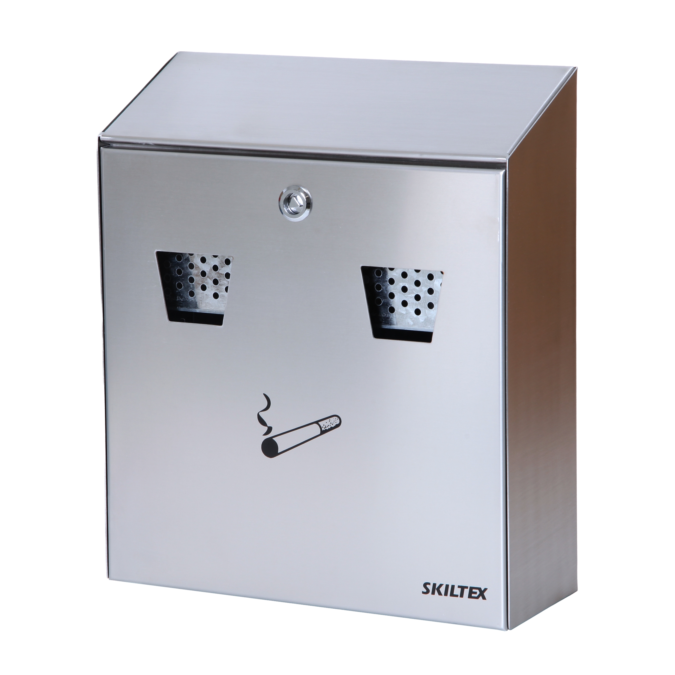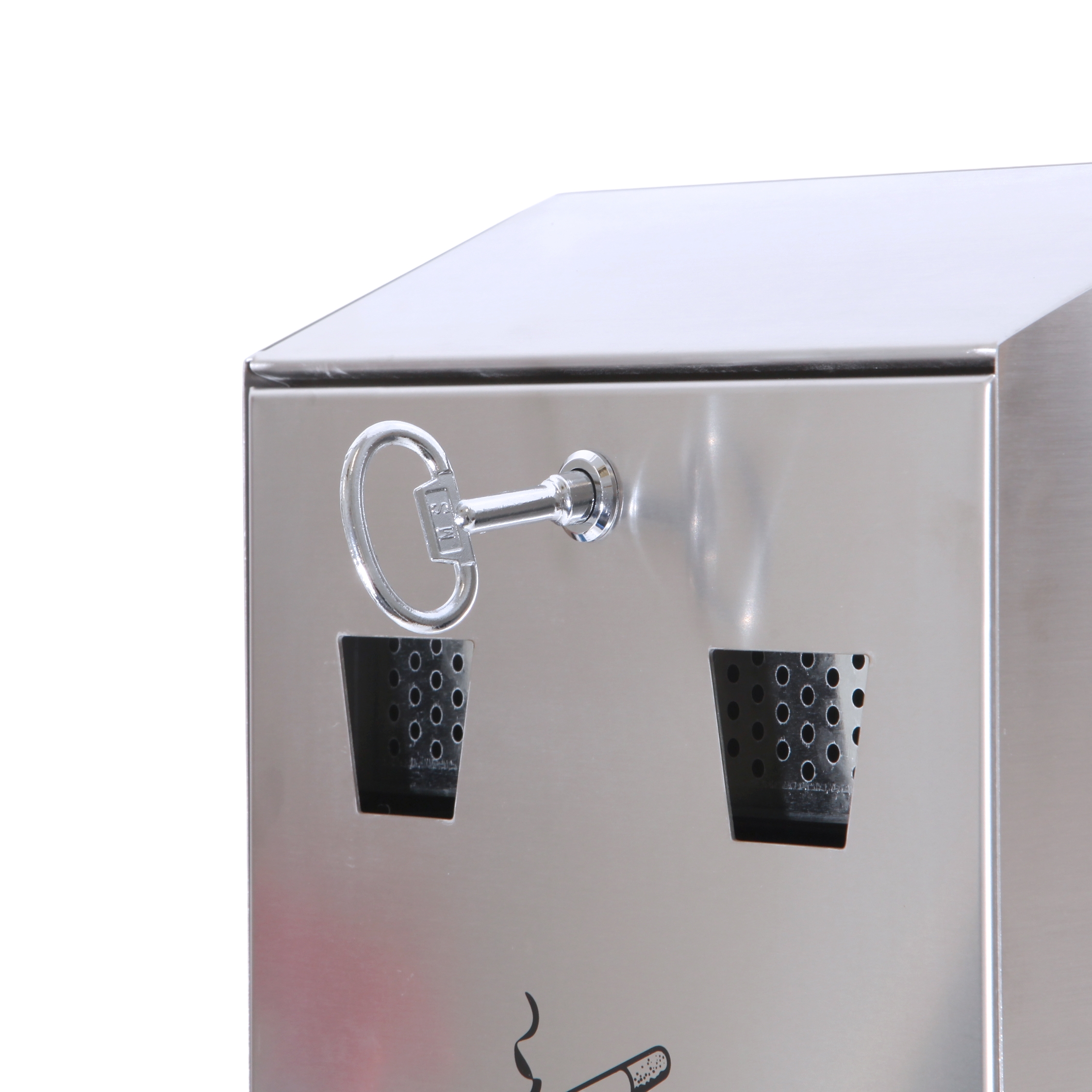Die Fronttür ist verschließbar, hat ein kleines Zigarettensymbol und besitzt zwei Löcher mit Grill zur einfachen Entsorgung von Zigaretten.