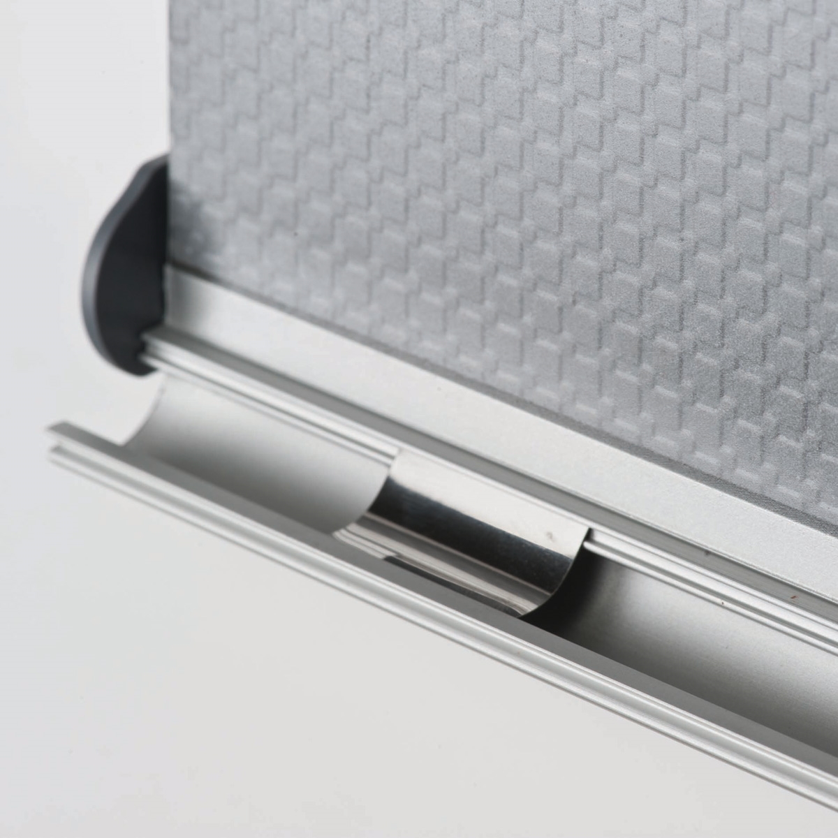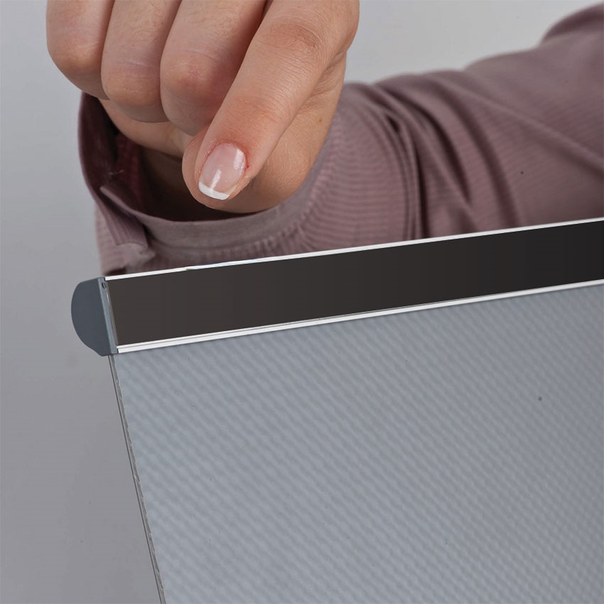 Die Front lässt sich leicht öffnen, um das Motiv in Sekundenschnelle zu wechseln. Die magnetische Rückseite macht das Schild ideal für Büros, Empfangsbereiche und Konferenzräume.