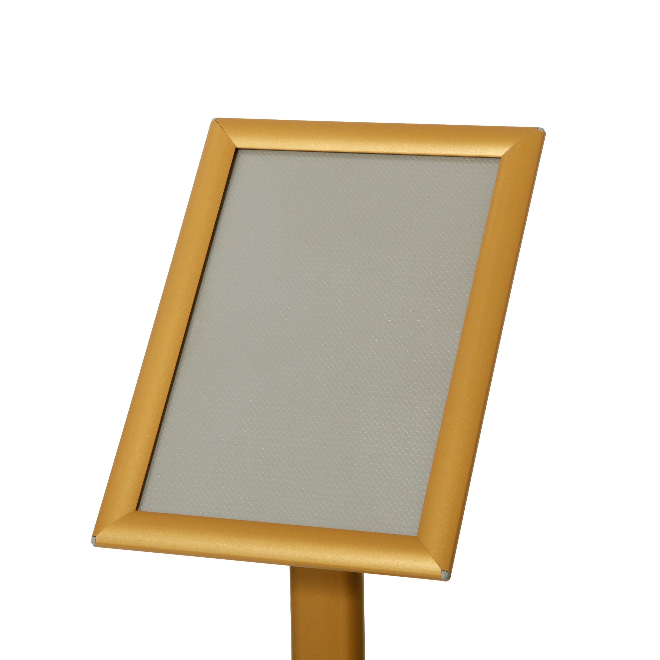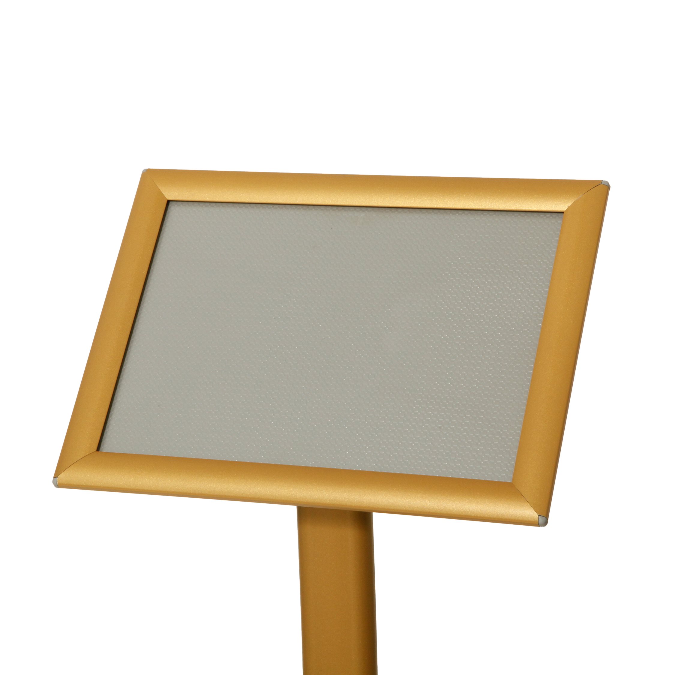 Die goldene Oberfläche des MenuPro Infoständers wurde sorgfältig ausgewählt, um sich harmonisch in jede Umgebung einzufügen. Ob als stilvoller Menüständer in Ihrem Restaurant oder als Wegweiser am Eingang Ihres Unternehmens – er verleiht eine Aura von Luxus und Raffinesse.