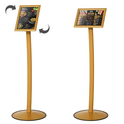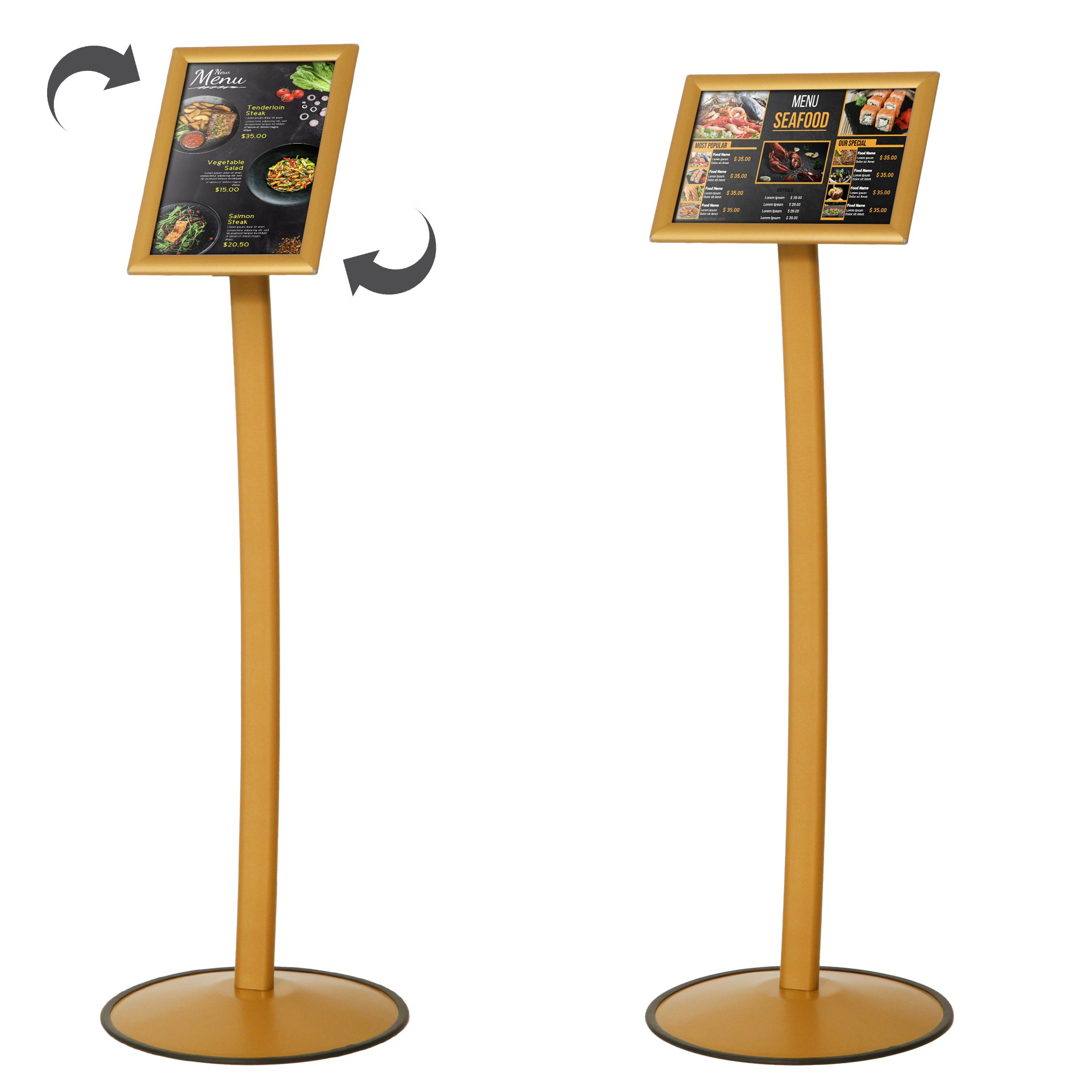 Möchten Sie Ihren Präsentationen eine luxuriöse und elegante Note verleihen? Unser MenuPro Infoständer im gebogenen Design wurde entwickelt, um mit seinem goldenen Glanz und seiner vielseitigen Nutzung zu beeindrucken. Dieser freistehende Infoständer ist für A4 Plakate geeignet, und seine geschwungene Form macht ihn ideal für Hoch- und Querformat, unabhängig davon, ob Sie eine vertikale oder horizontale Präsentation bevorzugen.