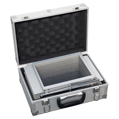 Entwickelt, um mobil und kompakt zu sein. Dieser zusammenklappbare Broschürenständer ist zu einer kleinen, leichten Einheit zusammengefaltet, die wieder in den mitgelieferten stabilen Alu-Koffer gepackt werden kann.