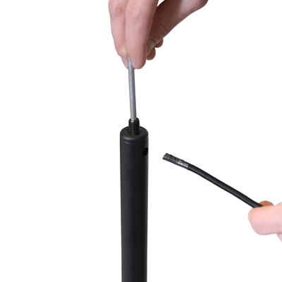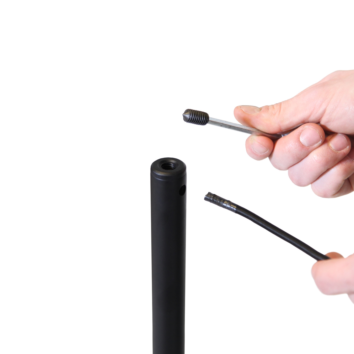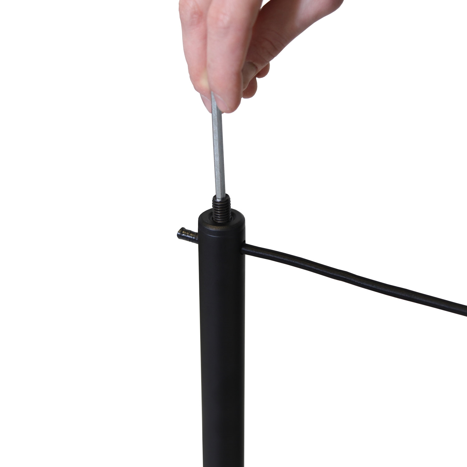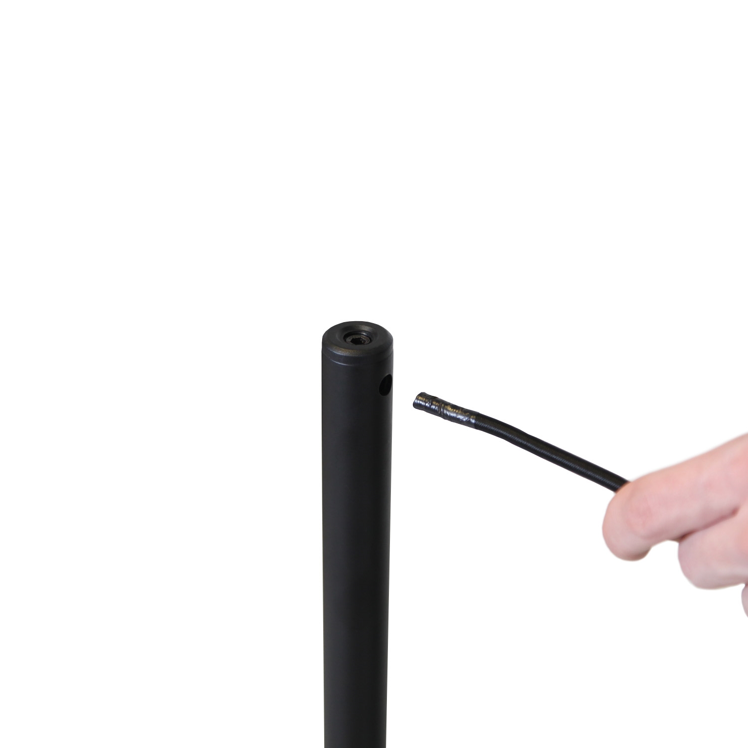 Um die Kordel zu befestigen, Kordel durch die Öffnung oben im Pfosten ziehen. Dort befindet sich auch eine Schraubmutter, die auf die Kordel aufgeschraubt werden kann, sodass sie fest und stramm sitzt.