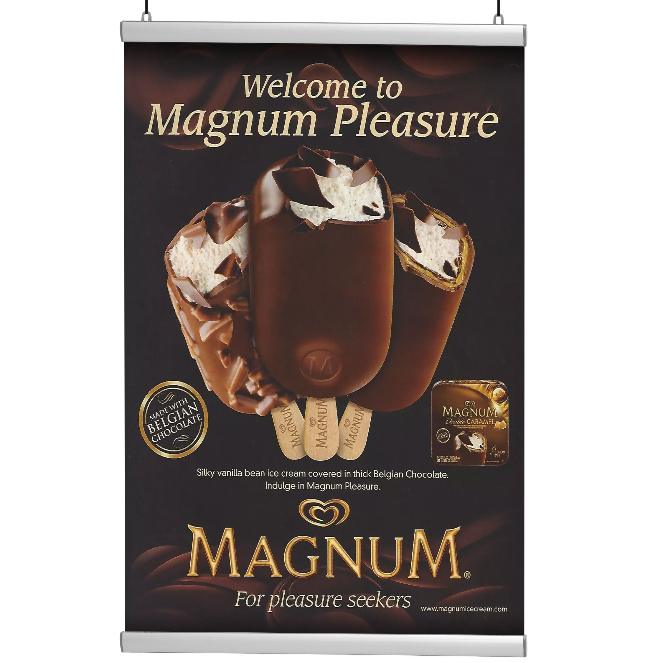 Exklusive Posterleisten aus eloxiertem Aluminium in Silber mit modernem Design. Diese Alu Posterleisten werden als Komplettset geliefert und sind sofort einsatzbereit für Wand- oder Deckenmontage. Dank Klemmprofil eignen sie sich sowohl für einseitige als auch doppelseitige Nutzung und sind ideal als Posterhalter.