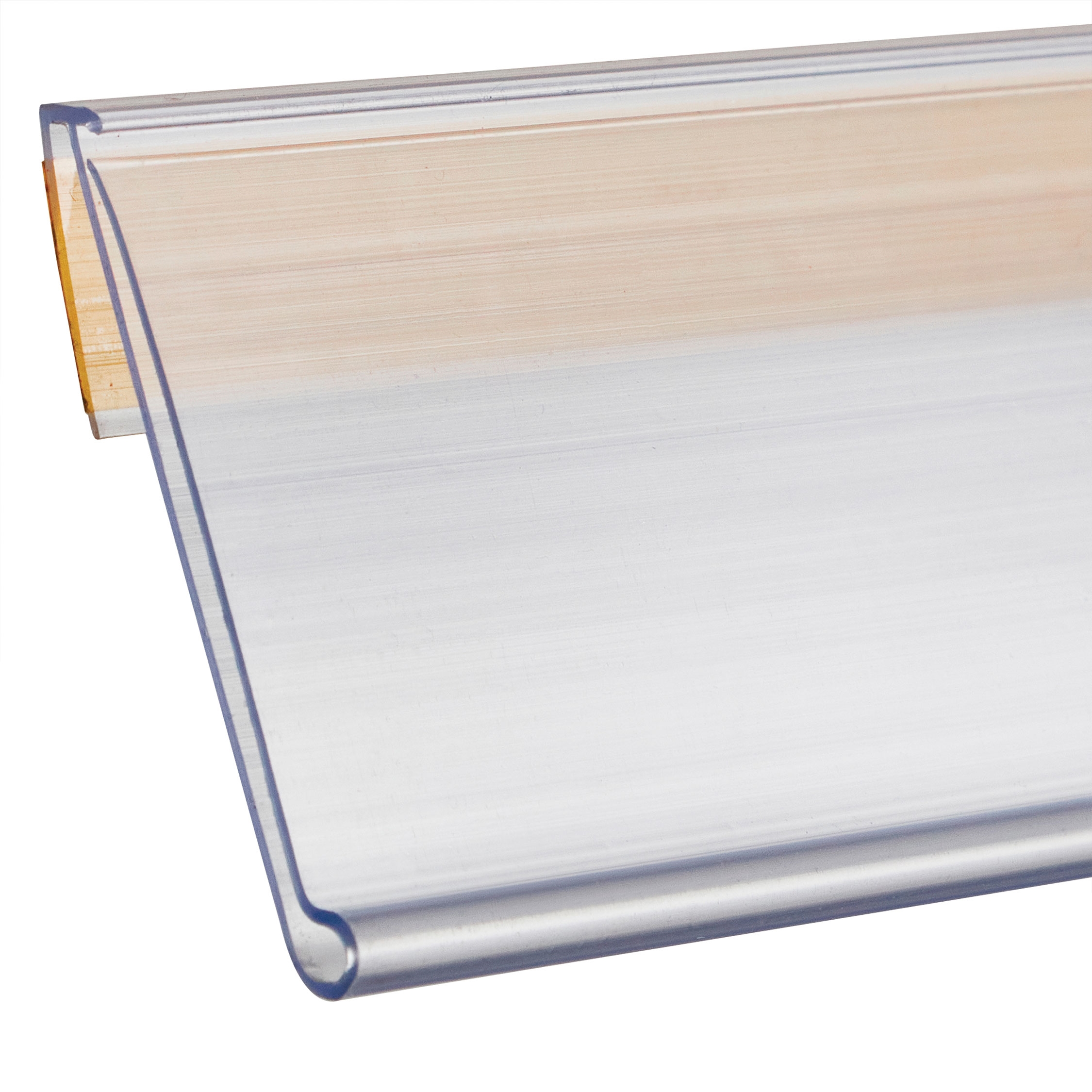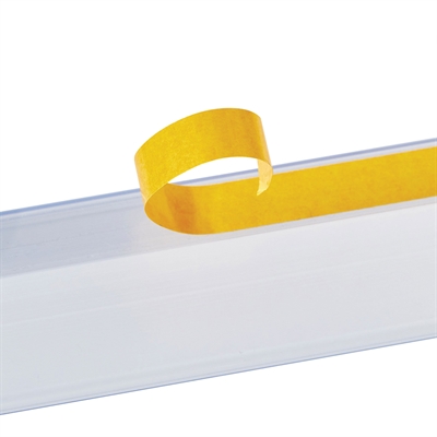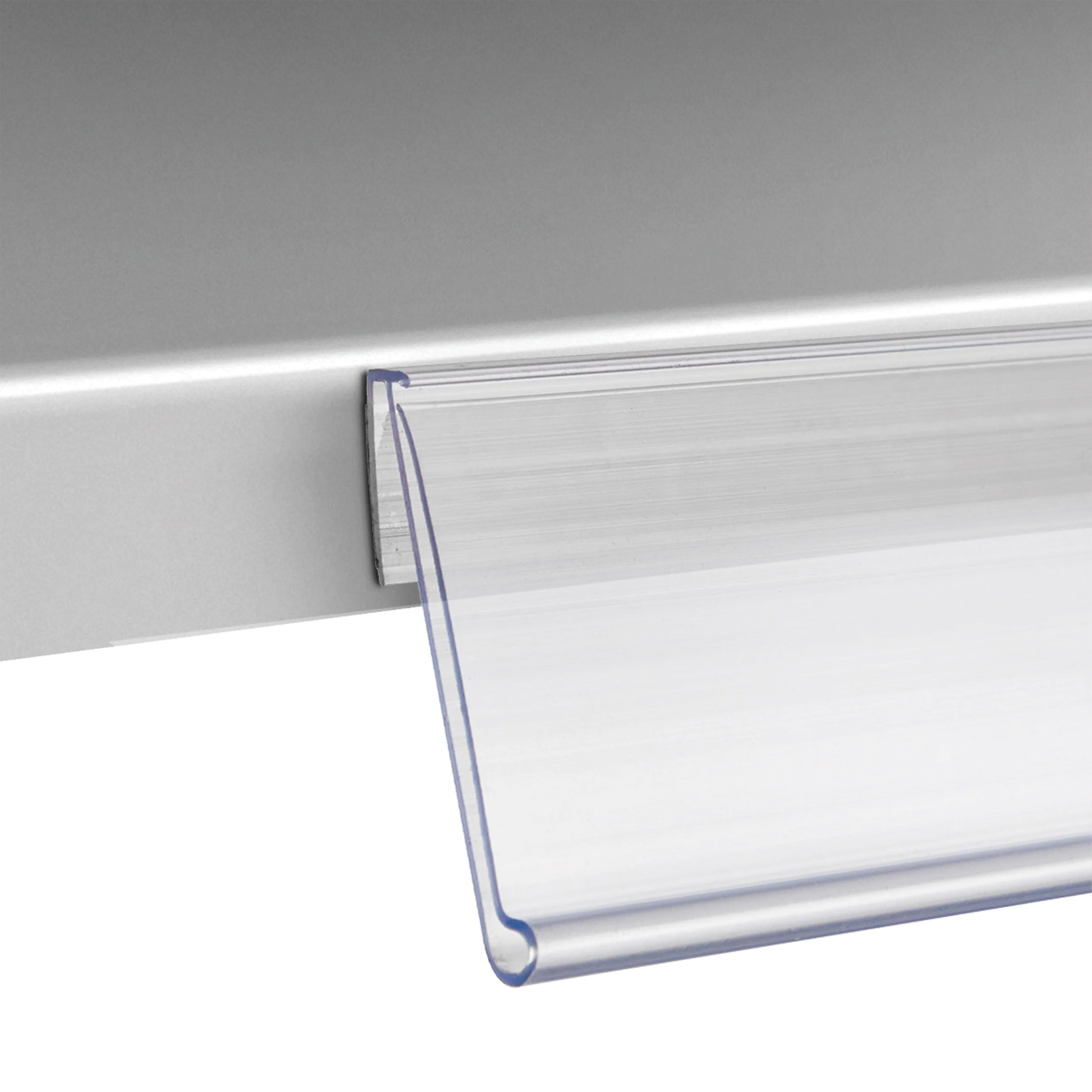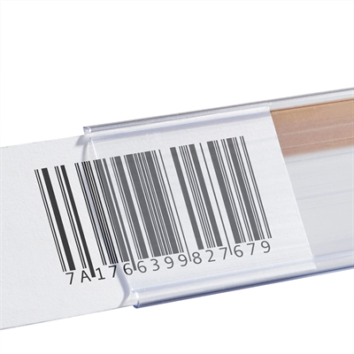 Scannerschiene / Etikettenhalter zur Präsentation von 39 mm hohen Etiketten auf flachen Regalböden. Dieses Modell verfügt über einen 15° Lesewinkel, der die Lesbarkeit von oben verbessert.