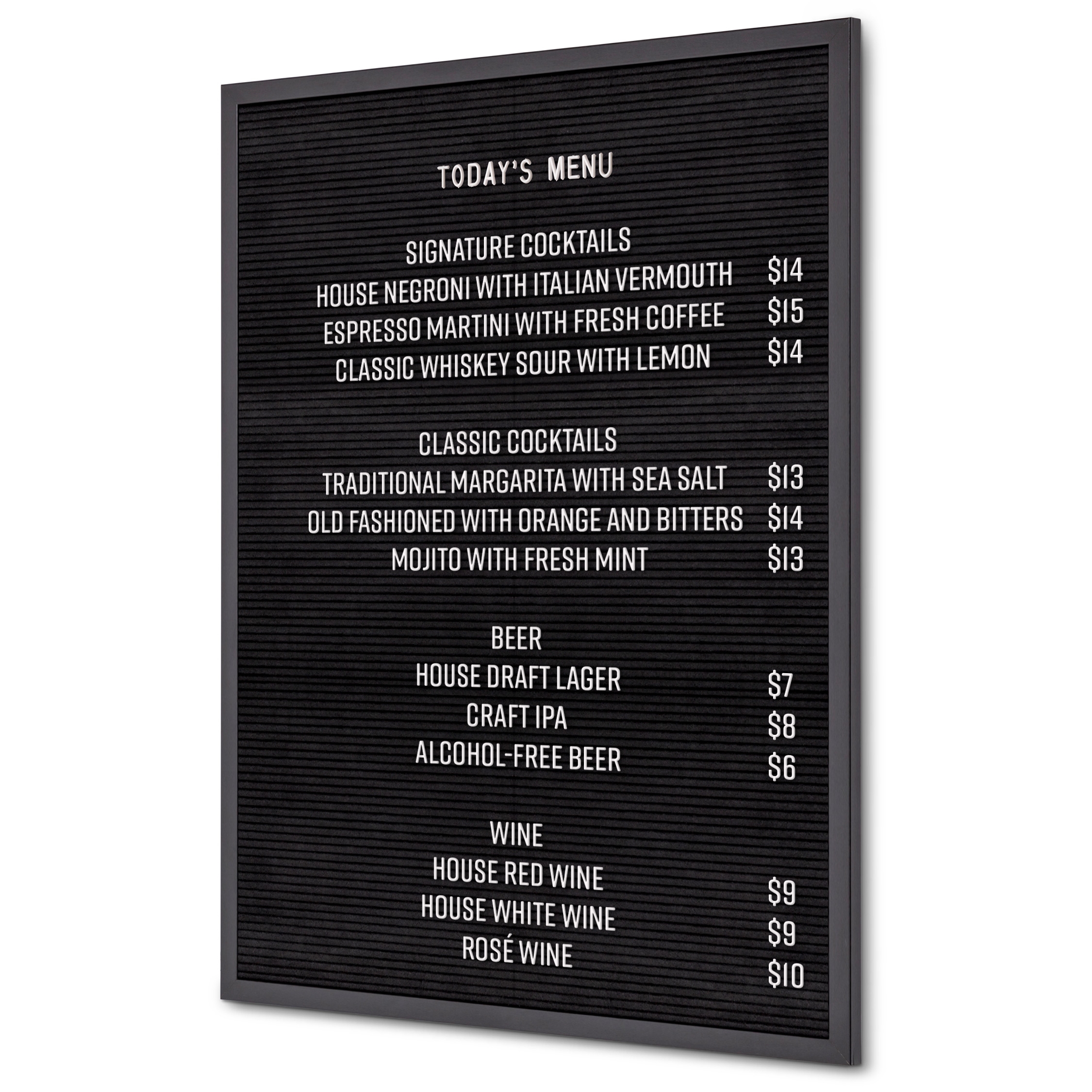 Die Tafel wird mit 330 weißen Plastikbuchstaben und 120 Zahlen geliefert. Die Buchstaben lassen sich einfach anbringen und anpassen, was das Aktualisieren besonders leicht macht. Die spezielle Oberfläche sorgt dafür, dass die weißen Plastikbuchstaben sicher an ihrem Platz bleiben.