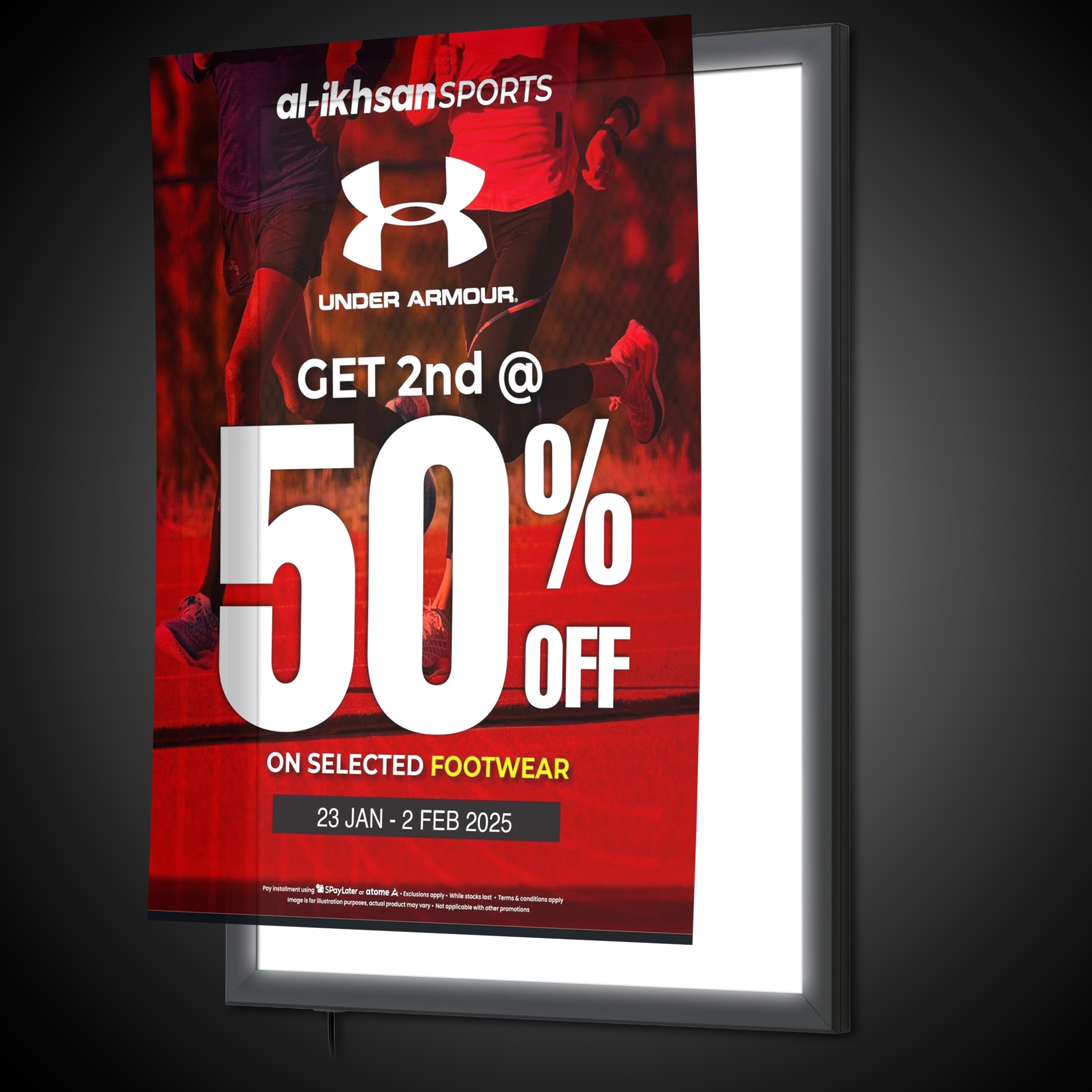 Diese Rahmen sind mit einem eleganten schwarzen 35-mm-Aluminiumprofil versehen und beleuchten die Poster mit starkem LED-Licht auf schöne und gleichmäßige Weise.