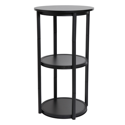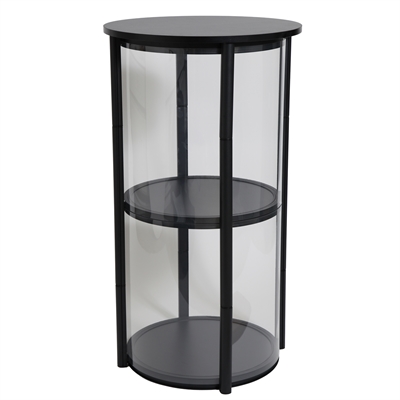 Die Vitrine ist mit einer schwarzen Tischplatte und 2 schwarzen Ablagen ausgestattet.