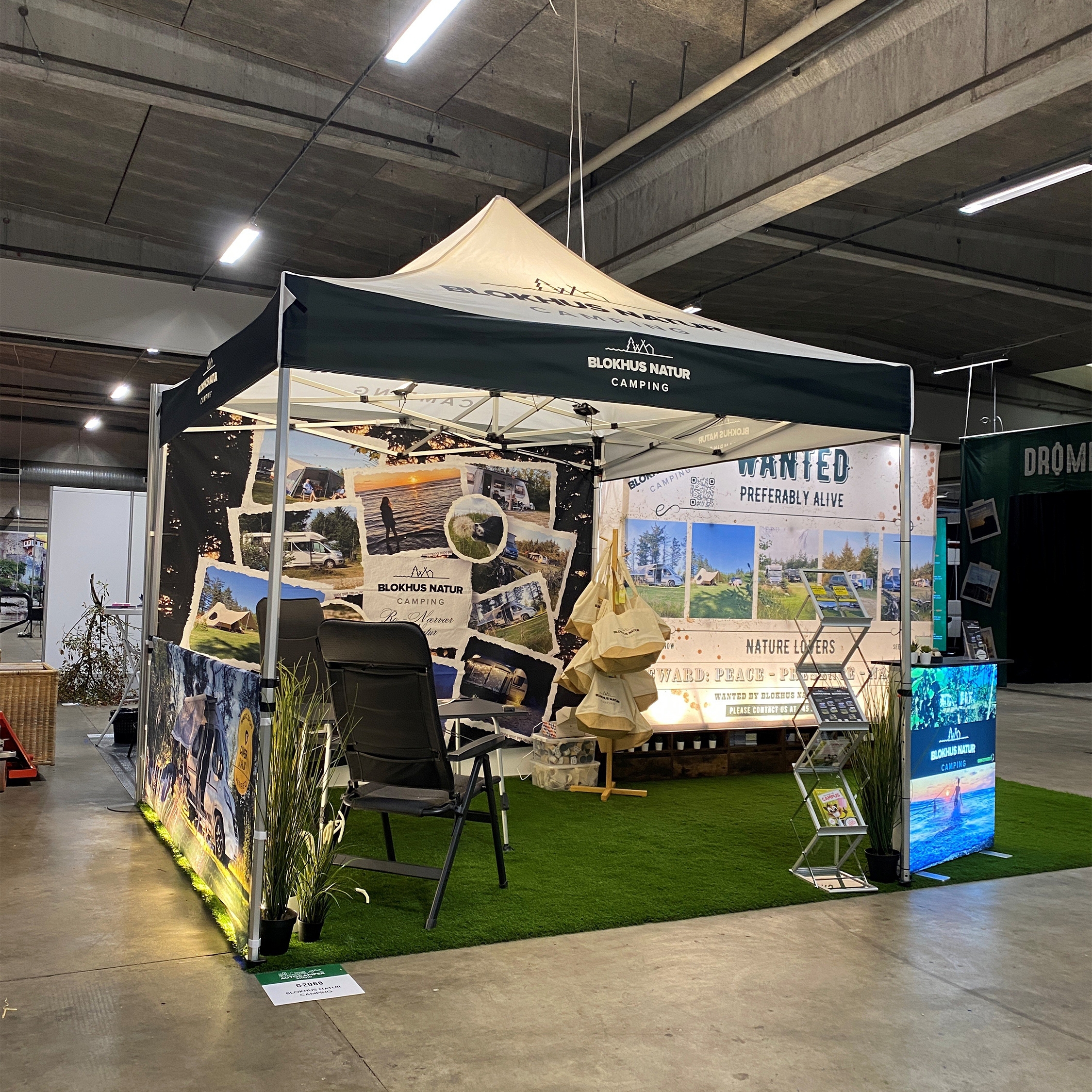 Der Stoffteil des Zeltes besteht aus 210 g/m2 Polyester mit Vollfarb CMYK Druck. Alle Nähte im oberen Teil sind versiegelt, um das Eindringen von Wasser zu verhindern, wodurch das Zelt wasserdicht ist.