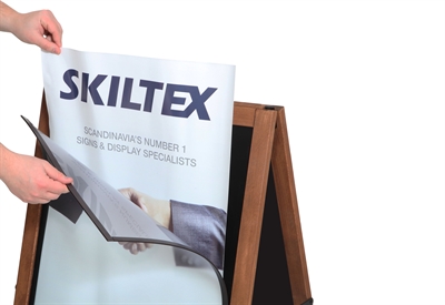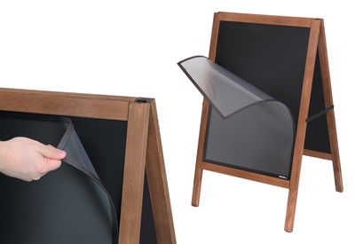 Dieses vielseitige Schild kann beides, als traditionaler Kundenstopper mit A2 Plakaten als auch als Tafelschild verwendet werden, das mit Kreide oder Kreidemarkern beschrieben werden kann.